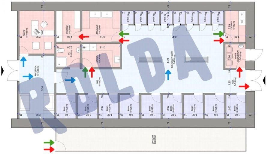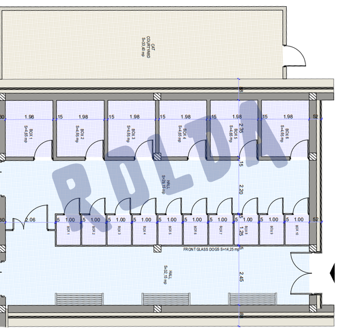 This area will consist of 6 boxes at 4.65 sq m each, as well as 10 glass-fronted boxes at 1.25 x 14.25 sq m.