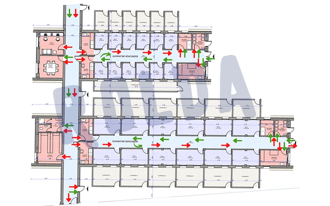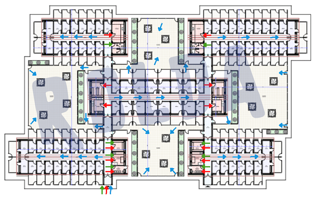 The colors (blue, green, and red) will indicate the access zone for ● visitors, ● volunteers, and ● staff.