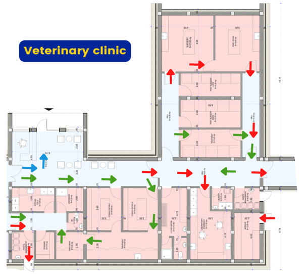 The colors (blue, green, and red) will indicate the access zone for ● visitors, ● volunteers, and ● staff.