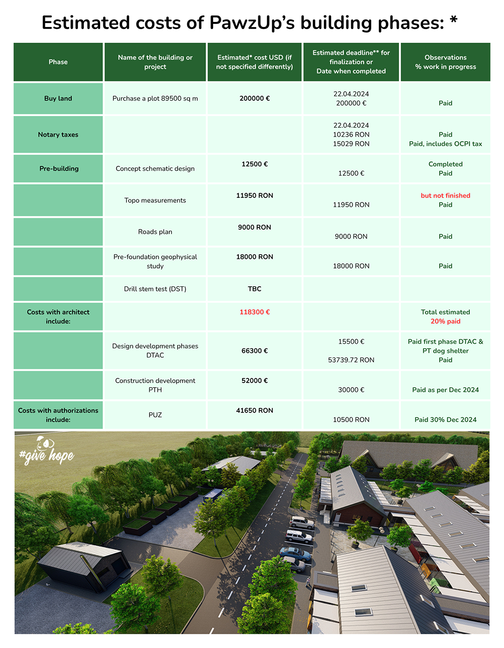 The PawzUp Center contains a number of distinct buildings as well as a number of warehouses, marked with numbers showing the order in which they will be built on the plan available at the bottom of this page. The entire construction project will take several years to complete. We have divided the project into four phases to ensure the capital costs of construction are manageable for our fragile budget and that our team can successfully absorb the logistic challenges.